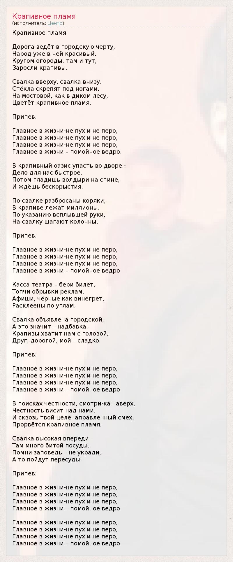 Крапивное пламя Дорога ведёт в городскую черту, Народ уже в ней красивый. Кругом огороды: там и тут, Заросли крапивы. Свалка вверху, свалка внизу. Стёкла скрепят под ногами. На мостовой, как в диком лесу, Цветёт крапивное пламя. Припев: Главное в жизни-не пух и не перо, Главное в жизни-не пух и не перо, Главное в жизни-не пух и не перо, Главное в жизни – помойное ведро. В крапивный оазис упасть во дворе - Дело для нас быстрое. Потом гладишь волдыри на спине, И ждёшь бескорыстия. По свалке разбросаны коряки, В крапиве лежат миллионы. По указанию всплывшей руки, На свалку шагают колонны. Припев: Главное в жизни-не пух и не перо, Главное в жизни-не пух и не перо, Главное в жизни-не пух и не перо, Главное в жизни – помойное ведро Касса театра – бери билет, Топчи обрывки реклам. Афиши, чёрные как винегрет, Расклеены по углам. Свалка объявлена городской, А это значит – надбавка. Крапивы хватит нам с головой, Друг, дорогой, мой – сладко. Припев: Главное в жизни-не пух и не перо, Главное в жизни-не пух и не перо, Главное в жизни-не пух и не перо, Главное в жизни – помойное ведро В поисках честности, смотри-ка наверх, Честность висит над нами. И сквозь твой целенаправленный смех, Прорвётся крапивное пламя. Свалка высокая впереди – Там много битой посуды. Помни заповедь – не укради, А то пойдут пересуды. Припев: Главное в жизни-не пух и не перо, Главное в жизни-не пух и не перо, Главное в жизни-не пух и не перо, Главное в жизни – помойное ведро Главное в жизни-не пух и не перо, Главное в жизни-не пух и не перо, Главное в жизни-не пух и не перо, Главное в жизни – помойное ведро