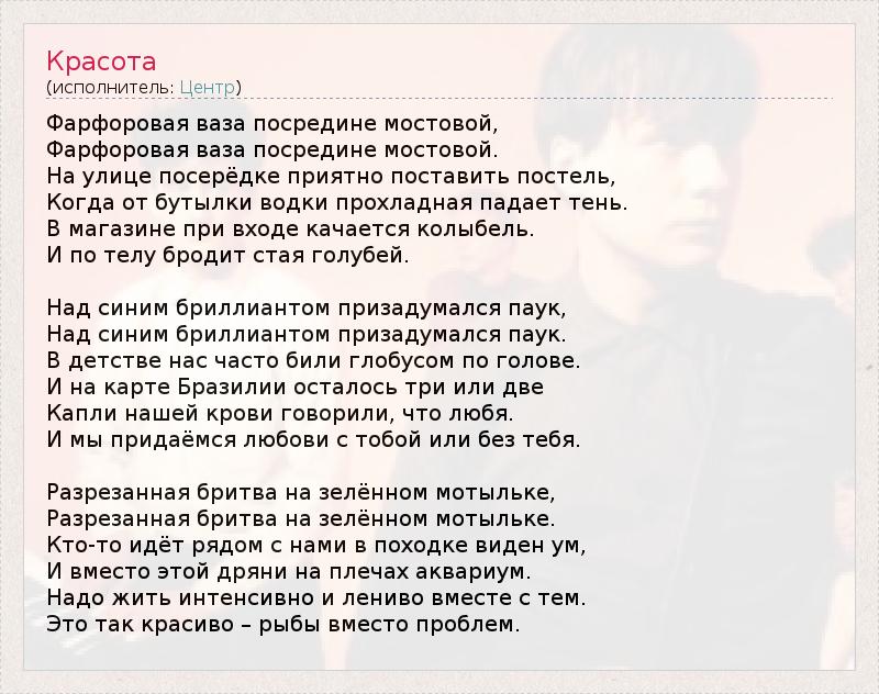 Это интересно:«Центр» — музыкальная группа, образованная в Москве в конце 1970-х годов под названием «777». C 1990 года базируется, помимо Москвы, в Лос-Анджелесе (США). Основатель и лидер группы — Василий Шумов. Стиль группы менялся от новой волны и русского рока до электроники.В начале 1980-х группа «Центр» стала известной в советском андерграунде того времени. Сформировался классический состав... продолжение