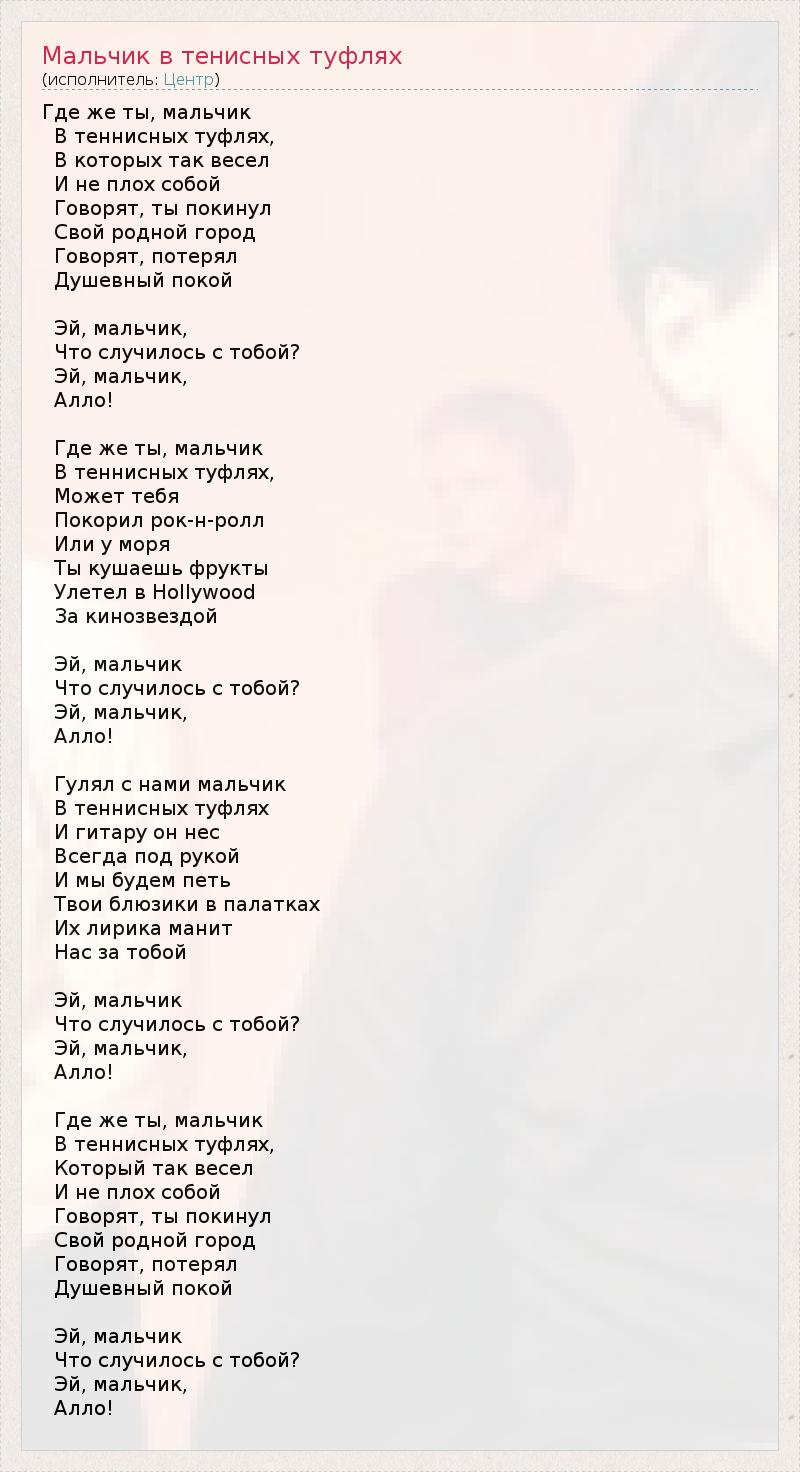 Где же ты, мальчик В теннисных туфлях, В которых так весел И не плох собой Говорят, ты покинул Свой родной город Говорят, потерял Душевный покой Эй, мальчик, Что случилось с тобой? Эй, мальчик, Алло! Где же ты, мальчик В теннисных туфлях, Может тебя Покорил рок-н-ролл Или у моря Ты кушаешь фрукты Улетел в Hollywood За кинозвездой Эй, мальчик Что случилось с тобой? Эй, мальчик, Алло! Гулял с нами мальчик В теннисных туфлях И гитару он нес Всегда под рукой И мы будем петь Твои блюзики в палатках Их лирика манит Нас за тобой Эй, мальчик Что случилось с тобой? Эй, мальчик, Алло! Где же ты, мальчик В теннисных туфлях, Который так весел И не плох собой Говорят, ты покинул Свой родной город Говорят, потерял Душевный покой Эй, мальчик Что случилось с тобой? Эй, мальчик, Алло!