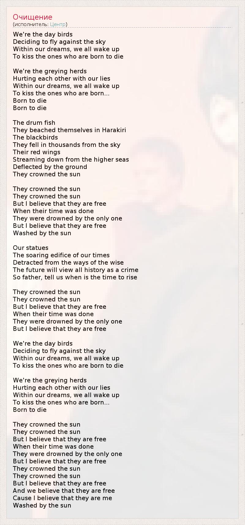 Мы дневные птицы, Решившие лететь против ветра. Мечтая, мы просыпаемся, Чтобы поцеловать тех, кто рождён, чтобы умереть. Мы седеющие стада тех, Кто ранит друг друга своей ложью. Мечтая, мы просыпаемся, Чтобы поцеловать тех, кто рождён... Рождён, чтобы умереть. Рождён, чтобы мереть. Рыбы Выбросились на берег, чтобы совершить харакири. Дрозды Тысячами упали с неба. Их красные крылья Пронеслись с небесного моря И, отразившись от земли, Они увенчали солнце. Они увенчали солнце. Они увенчали солнце. Но я верю, что они стали свободными, Когда их время пришло. Они были потоплены Всевышним, Но я верю, что они стали свободными После очищения солнцем. Наши памятники - Это возвышающаяся доктрина нашего времени, Отвлечённая от мудрых путей развития. Будущее будет считать историю преступлением. Поэтому отец, скажи, когда настанет время восстать. Они увенчали солнце. Они увенчали солнце. Но я верю, что они стали свободными, Когда их время пришло. Они были потоплены Всевышним, Но я верю, что они стали свободными. Мы дневные птицы, Решившие лететь против ветра. Мечтая, мы просыпаемся, Чтобы поцеловать тех, кто рождён, чтобы умереть. Мы седеющие стада тех, Кто ранит друг друга своей ложью. Мечтая, мы просыпаемся, Чтобы поцеловать тех, кто рождён... Рождён, чтобы умереть. Они увенчали солнце. Они увенчали солнце. Но я верю, что они стали свободными, Когда их время пришло. Они были потоплены Всевышним, Но я верю, что они стали свободными, Они увенчали солнце. Они увенчали солнце. Но я верю, что они стали свободными, И мы верим, что они стали свободными, Потому что я верю, что они - это я, Очищенный солнцем.