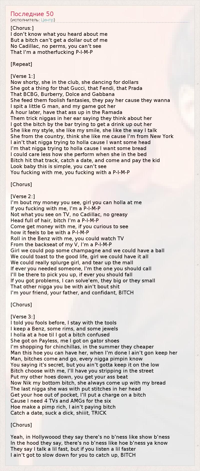 [Chorus:] I don't know what you heard about me But a bitch can't get a dollar out of me No Cadillac, no perms, you can't see That I'm a motherfucking P-I-M-P [Repeat] [Verse 1:] Now shorty, she in the club, she dancing for dollars She got a thing for that Gucci, that Fendi, that Prada That BCBG, Burberry, Dolce and Gabbana She feed them foolish fantasies, they pay her cause they wanna I spit a little G man, and my game got her A hour later, have that ass up in the Ramada Them trick niggas in her ear saying they think about her I got the bitch by the bar trying to get a drink up out her She like my style, she like my smile, she like the way I talk She from the country, think she like me cause I'm from New York I ain't that nigga trying to holla cause I want some head I'm that nigga trying to holla cause I want some bread I could care less how she perform when she in the bed Bitch hit that track, catch a date, and come and pay the kid Look baby this is simple, you can't see You fucking with me, you fucking with a P-I-M-P [Chorus] [Verse 2:] I'm bout my money you see, girl you can holla at me If you fucking with me, I'm a P-I-M-P Not what you see on TV, no Cadillac, no greasy Head full of hair, bitch I'm a P-I-M-P Come get money with me, if you curious to see how it feels to be with a P-I-M-P Roll in the Benz with me, you could watch TV From the backseat of my V, I’m a P-I-M-P Girl we could pop some champagne and we could have a ball We could toast to the good life, girl we could have it all We could really splurge girl, and tear up the mall If ever you needed someone, I'm the one you should call I'll be there to pick you up, if ever you should fall If you got problems, I can solve'em, they big or they small That other nigga you be with ain't bout shit I'm your friend, your father, and confidant, BITCH [Chorus] [Verse 3:] I told you fools before, I stay with the tools I keep a Benz, some rims, and some jewels I holla at a hoe til I got a bitch confused She got on Payless, me I got on gator shoes I'm shopping for chinchillas, in the summer they cheaper Man this hoe you can have her, when I'm done I ain't gon keep her Man, bitches come and go, every nigga pimpin know You saying it's secret, but you ain't gotta keep it on the low Bitch choose with me, I'll have you stripping in the street Put my other hoes down, you get your ass beat Now Nik my bottom bitch, she always come up with my bread The last nigga she was with put stitches in her head Get your hoe out of pocket, I'll put a charge on a bitch Cause I need 4 TVs and AMGs for the six Hoe make a pimp rich, I ain't paying bitch Catch a date, suck a dick, shiiit, TRICK [Chorus] Yeah, in Hollywoood they say there's no b'ness like show b'ness In the hood they say, there's no b'ness like hoe b'ness ya know They say I talk a lil fast, but if you listen a lil faster I ain't got to slow down for you to catch up, BITCH