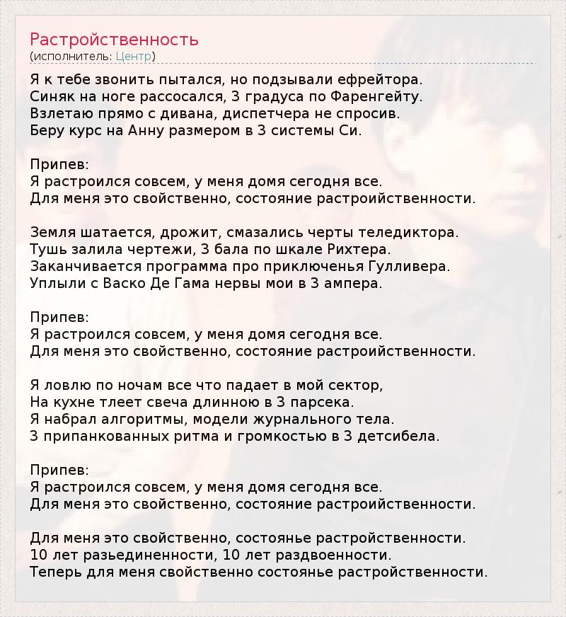 Это интересно:«Центр» — музыкальная группа, образованная в Москве в конце 1970-х годов под названием «777». C 1990 года базируется, помимо Москвы, в Лос-Анджелесе (США). Основатель и лидер группы — Василий Шумов. Стиль группы менялся от новой волны и русского рока до электроники.В начале 1980-х группа «Центр» стала известной в советском андерграунде того времени. Сформировался классический состав... продолжение