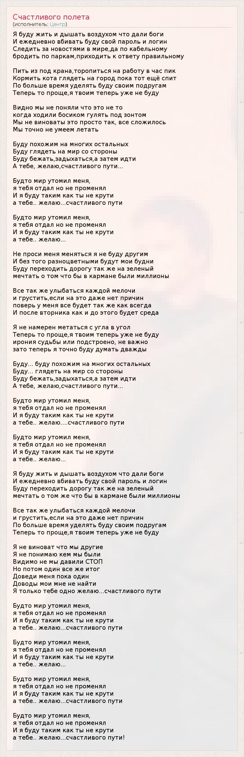 Я буду жить и дышать воздухом что дали боги И ежедневно вбивать буду свой пароль и логин Следить за новостями в мире,да по кабельному бродить по паркам,приходить к ответу правильному Пить из под крана,торопиться на работу в час пик Кормить кота глядеть на город пока тот ещё спит По больше время уделять буду своим подругам Теперь то проще,я твоим теперь уже не буду Видно мы не поняли что это не то когда ходили босиком гулять под зонтом Мы не виноваты это просто так, все сложилось Мы точно не умеем летать Буду похожим на многих остальных Буду глядеть на мир со стороны Буду бежать,задыхаться,а затем идти А тебе, желаю,счастливого пути... Будто мир утомил меня, я тебя отдал но не променял И я буду таким как ты не крути а тебе.. желаю...счастливого пути Будто мир утомил меня, я тебя отдал но не променял И я буду таким как ты не крути а тебе.. желаю... Не проси меня меняться я не буду другим И без того разноцветными будут мои будни Буду переходить дорогу так же на зеленый мечтать о том что бы в кармане были миллионы Все так же улыбаться каждой мелочи и грустить,если на это даже нет причин поверь у меня все будет так же как всегда И после вторника как и до этого будет среда Я не намерен метаться с угла в угол Теперь то проще,я твоим теперь уже не буду ирония судьбы или подстроено, не важно зато теперь я точно буду думать дважды Буду... буду похожим на многих остальных Буду... глядеть на мир со стороны Буду бежать,задыхаться,а затем идти А тебе, желаю,счастливого пути... Будто мир утомил меня, я тебя отдал но не променял И я буду таким как ты не крути а тебе.. желаю....счастливого пути Будто мир утомил меня, я тебя отдал но не променял И я буду таким как ты не крути а тебе.. желаю... Я буду жить и дышать воздухом что дали боги И ежедневно вбивать буду свой пароль и логин Буду переходить дорогу так же на зеленый мечтать о том же что бы в кармане были миллионы Все так же улыбаться каждой мелочи и грустить,если на это даже нет причин По больше время уделять буду своим подругам Теперь то проще,я твоим теперь уже не буду Я не виноват что мы другие Я не понимаю кем мы были Видимо не мы давили СТОП Но потом один все же итог Доведи меня пока один Доводы мои мне не найти Я только тебе одно желаю...счастливого пути Будто мир утомил меня, я тебя отдал но не променял И я буду таким как ты не крути а тебе.. желаю...счастливого пути Будто мир утомил меня, я тебя отдал но не променял И я буду таким как ты не крути а тебе.. желаю... Будто мир утомил меня, я тебя отдал но не променял И я буду таким как ты не крути а тебе.. желаю...счастливого пути Будто мир утомил меня, я тебя отдал но не променял И я буду таким как ты не крути а тебе.. желаю...счастливого пути!