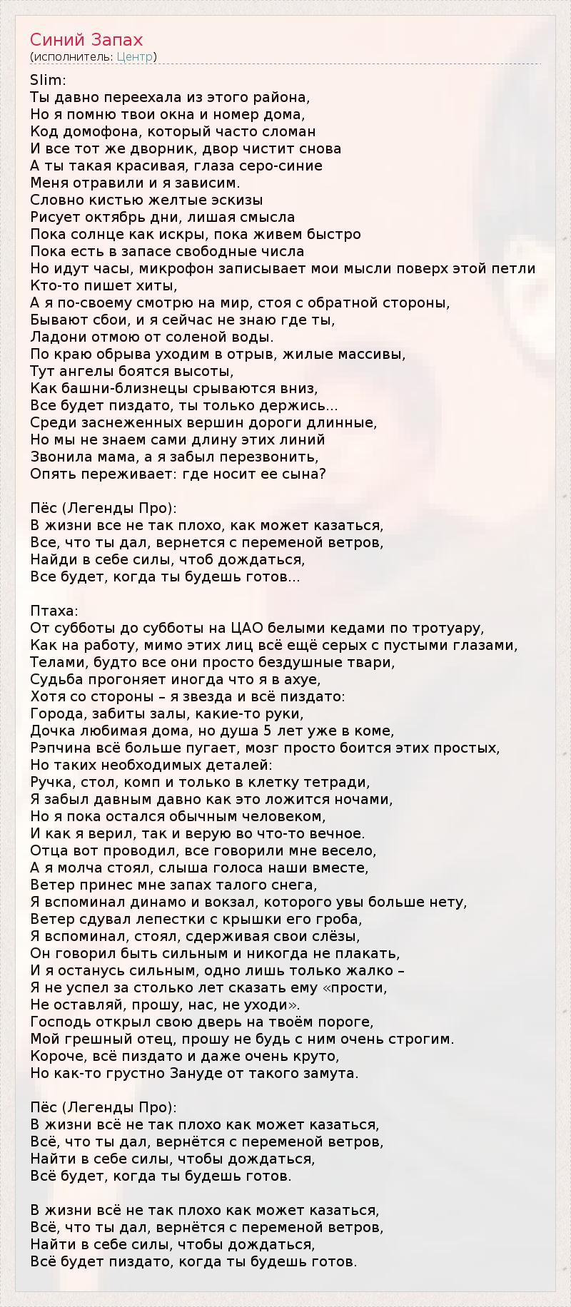 Slim: Ты давно переехала из этого района, Но я помню твои окна и номер дома, Код домофона, который часто сломан И все тот же дворник, двор чистит снова А ты такая красивая, глаза серо-синие Меня отравили и я зависим. Словно кистью желтые эскизы Рисует октябрь дни, лишая смысла Пока солнце как искры, пока живем быстро Пока есть в запасе свободные числа Но идут часы, микрофон записывает мои мысли поверх этой петли Кто-то пишет хиты, А я по-своему смотрю на мир, стоя с обратной стороны, Бывают сбои, и я сейчас не знаю где ты, Ладони отмою от соленой воды. По краю обрыва уходим в отрыв, жилые массивы, Тут ангелы боятся высоты, Как башни-близнецы срываются вниз, Все будет пиздато, ты только держись... Среди заснеженных вершин дороги длинные, Но мы не знаем сами длину этих линий Звонила мама, а я забыл перезвонить, Опять переживает: где носит ее сына? Пёс (Легенды Про): В жизни все не так плохо, как может казаться, Все, что ты дал, вернется с переменой ветров, Найди в себе силы, чтоб дождаться, Все будет, когда ты будешь готов... Птаха: От субботы до субботы на ЦАО белыми кедами по тротуару, Как на работу, мимо этих лиц всё ещё серых с пустыми глазами, Телами, будто все они просто бездушные твари, Судьба прогоняет иногда что я в ахуе, Хотя со стороны – я звезда и всё пиздато: Города, забиты залы, какие-то руки, Дочка любимая дома, но душа 5 лет уже в коме, Рэпчина всё больше пугает, мозг просто боится этих простых, Но таких необходимых деталей: Ручка, стол, комп и только в клетку тетради, Я забыл давным давно как это ложится ночами, Но я пока остался обычным человеком, И как я верил, так и верую во что-то вечное. Отца вот проводил, все говорили мне весело, А я молча стоял, слыша голоса наши вместе, Ветер принес мне запах талого снега, Я вспоминал динамо и вокзал, которого увы больше нету, Ветер сдувал лепестки с крышки его гроба, Я вспоминал, стоял, сдерживая свои слёзы, Он говорил быть сильным и никогда не плакать, И я останусь сильным, одно лишь только жалко – Я не успел за столько лет сказать ему «прости, Не оставляй, прошу, нас, не уходи». Господь открыл свою дверь на твоём пороге, Мой грешный отец, прошу не будь с ним очень строгим. Короче, всё пиздато и даже очень круто, Но как-то грустно Зануде от такого замута. Пёс (Легенды Про): В жизни всё не так плохо как может казаться, Всё, что ты дал, вернётся с переменой ветров, Найти в себе силы, чтобы дождаться, Всё будет, когда ты будешь готов. В жизни всё не так плохо как может казаться, Всё, что ты дал, вернётся с переменой ветров, Найти в себе силы, чтобы дождаться, Всё будет пиздато, когда ты будешь готов.