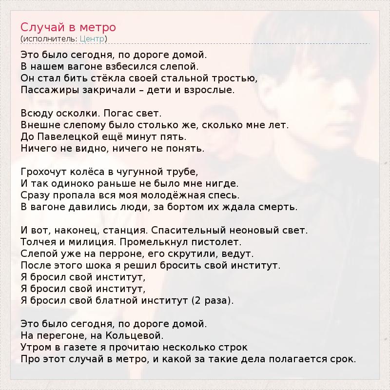 Это было сегодня, по дороге домой. В нашем вагоне взбесился слепой. Он стал бить стёкла своей стальной тростью, Пассажиры закричали – дети и взрослые. Всюду осколки. Погас свет. Внешне слепому было столько же, сколько мне лет. До Павелецкой ещё минут пять. Ничего не видно, ничего не понять. Грохочут колёса в чугунной трубе, И так одиноко раньше не было мне нигде. Сразу пропала вся моя молодёжная спесь. В вагоне давились люди, за бортом их ждала смерть. И вот, наконец, станция. Спасительный неоновый свет. Толчея и милиция. Промелькнул пистолет. Слепой уже на перроне, его скрутили, ведут. После этого шока я решил бросить свой институт. Я бросил свой институт, Я бросил свой институт, Я бросил свой блатной институт (2 раза). Это было сегодня, по дороге домой. На перегоне, на Кольцевой. Утром в газете я прочитаю несколько строк Про этот случай в метро, и какой за такие дела полагается срок.