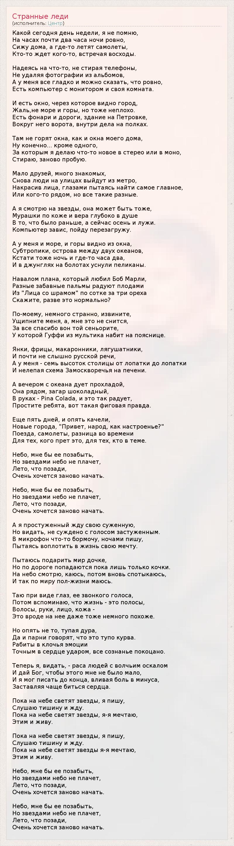 Какой сегодня день недели, я не помню, На часах почти два часа ночи ровно, Сижу дома, а где-то летят самолеты, Кто-то ждет кого-то, встречая восходы. Надеясь на что-то, не стирая телефоны, Не удаляя фотографии из альбомов, А у меня все гладко и можно сказать, что ровно, Есть компьютер с монитором и своя комната. И есть окно, через которое видно город, Жаль,не море и горы, но тоже неплохо. Есть фонари и дороги, здание на Петровке, Вокруг него ворота, внутри дела на полках. Там не горят окна, как и окна моего дома, Ну конечно... кроме одного, За которым я делаю что-то новое в стерео или в моно, Стираю, заново пробую. Мало друзей, много знакомых, Снова люди на улицах выйдут из метро, Накрасив лица, глазами пытаясь найти самое главное, Или кого-то рядом, но все такие разные. А я смотрю на звезды, она может быть тоже, Мурашки по коже и вера глубоко в душе В то, что было раньше, а сейчас осень и лужи. Компьютер завис, пойду перезагружу. А у меня и море, и горы видно из окна, Субтропики, острова между двух океанов, Кстати тоже ночь и где-то часа два, И в джунглях на болотах уснули пеликаны. Навалом плана, который любил Боб Марли, Разные забавные пальмы радуют плодами Из "Лица со шрамом" по сотке за три ореха Скажите, разве это нормально? По-моему, немного странно, извините, Ущипните меня, а, мне это не снится, За все спасибо вон той сеньорите, У которой Гуффи из мультика набит на пояснице. Янки, фрицы, макаронники, лягушатники, И почти не слышно русской речи, А у меня - семь высоток столицы от лопатки до лопатки И нелепая схема Замоскворечья на печени. А вечером с океана дует прохладой, Она рядом, загар шоколадный, В руках - Pina Colada, и это так радует, Простите ребята, вот такая фиговая правда. Еще пять дней, и опять качели, Новые города, "Привет, народ, как настроенье?" Поезда, самолеты, разница во времени Для тех, кого прет это, для тех, кто в теме. Небо, мне бы ее позабыть, Но звездами небо не плачет, Лето, что позади, Очень хочется заново начать. Небо, мне бы ее позабыть, Но звездами небо не плачет, Лето, что позади, Очень хочется заново начать. А я простуженный жду свою суженную, Но видать, не суждено с голосом застуженным. В микрофон что-то бормочу, ночами пишу, Пытаясь воплотить в жизнь свою мечту. Пытаюсь подарить мир дочке, Но по дороге попадаются пока лишь только кочки. На небо смотрю, каюсь, потом вновь спотыкаюсь, И так по миру пол-жизни маюсь. Таю при виде глаз, ее звонкого голоса, Потом вспоминаю, что жизнь - это полосы, Волосы, руки, лицо, кожа - Это вроде на нее даже тоже немного похоже. Но опять не то, тупая дура, Да и парни говорят, что это тупо курва. Рабиты в клочья эмоции Точным в сердце ударом, все сознанье покоцано. Теперь я, видать, - раса людей с волчьим оскалом И дай Бог, чтобы этого мне не было мало, И я мог писать до конца, вливая боль в минуса, Заставляя чаще биться сердца. Пока на небе светят звезды, я пишу, Слушаю тишину и жду. Пока на небе светят звезды, я-я мечтаю, Этим и живу. Пока на небе светят звезды, я пишу, Слушаю тишину и жду. Пока на небе светят звезды я-я мечтаю, Этим и живу. Небо, мне бы ее позабыть, Но звездами небо не плачет, Лето, что позади, Очень хочется заново начать. Небо, мне бы ее позабыть, Но звездами небо не плачет, Лето, что позади, Очень хочется заново начать.