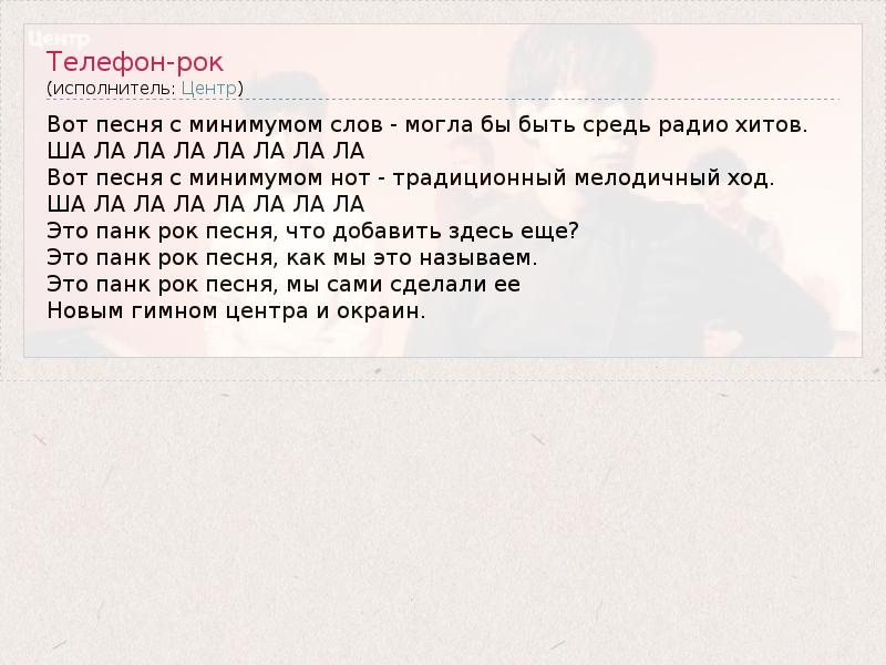 Вот песня с минимумом слов - могла бы быть средь радио хитов. ША ЛА ЛА ЛА ЛА ЛА ЛА ЛА Вот песня с минимумом нот - традиционный мелодичный ход. ША ЛА ЛА ЛА ЛА ЛА ЛА ЛА Это панк рок песня, что добавить здесь еще? Это панк рок песня, как мы это называем. Это панк рок песня, мы сами сделали ее Новым гимном центра и окраин.