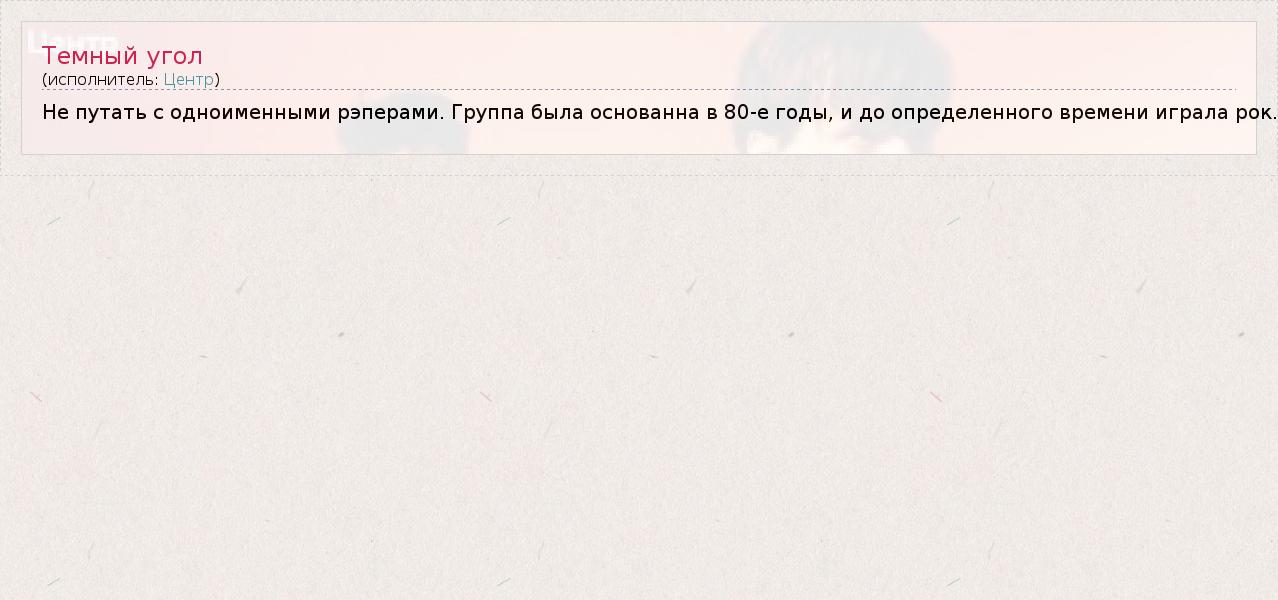 Это интересно:«Центр» — музыкальная группа, образованная в Москве в конце 1970-х годов под названием «777». C 1990 года базируется, помимо Москвы, в Лос-Анджелесе (США). Основатель и лидер группы — Василий Шумов. Стиль группы менялся от новой волны и русского рока до электроники.В начале 1980-х группа «Центр» стала известной в советском андерграунде того времени. Сформировался классический состав... продолжение