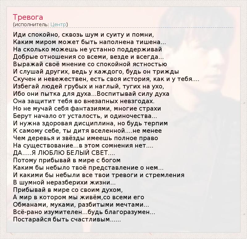 Иди спокойно, сквозь шум и суиту и помни, Каким миром может быть наполнена тишена... На сколько можешь не устанно поддерживай Добрые отношения со всеми, везде и всегда... Выражай своё мнение со спокойной ястностью И слушай других, ведь у каждого, будь он трижды Скучен и невежествен, есть своя история, как и у тебя.... Избегай людей грубых и наглый, тугих на ухо, Ибо они пытка для духа...Воспитывай силу духа Она защитит тебя во внезапных невзгодах. Но не мучай себя фантазиями, многие страхи Берут начало от усталость, и одиночества... И нужна здоровая дисциплина, но будь терпим К самому себе, ты дитя вселенной....не менее Чем деревья и звёзды имеешь полное право На существование...в этом сомнения нет.... ДА.....Я ЛЮБЛЮ БЕЛЫЙ СВЕТ.... Потому прибывай в мире с богом Каким бы небыло твоё представление о нем... И какими бы небыли все твои тревоги и стремления В шумной неразберихи жизни... Прибывай в мире со своим духом, А мир в котором мы живём,со всеми его Обманами, муками, разбитыми мечтами... Всё-рано изумителен...будь благоразумен... Постарайся быть счастливым......