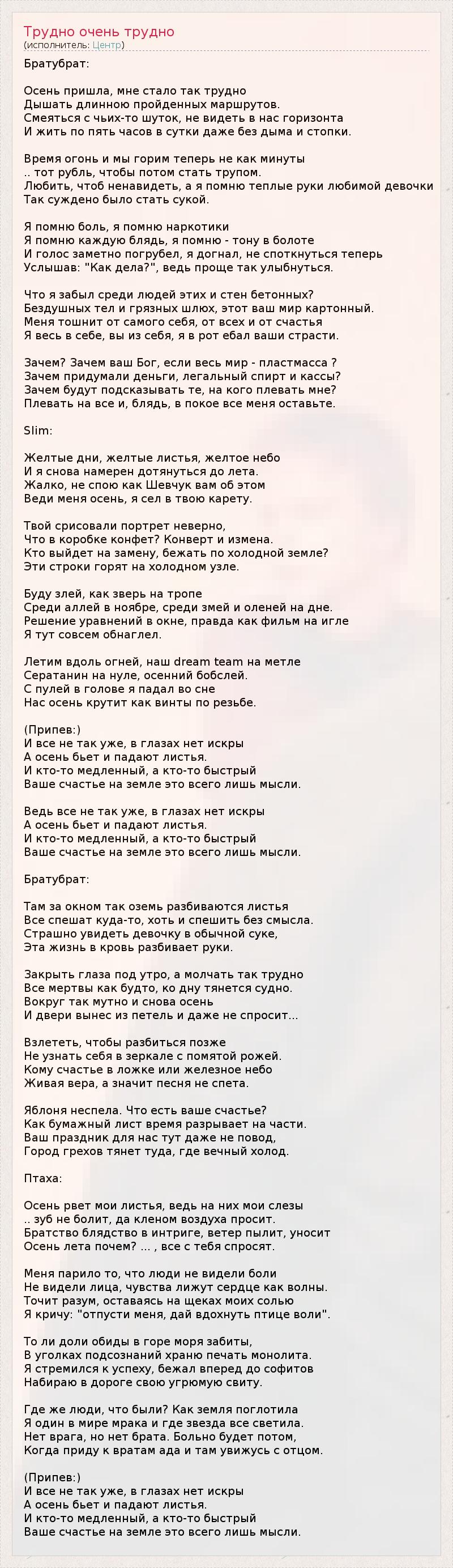 Братубрат: Осень пришла, мне стало так трудно Дышать длинною пройденных маршрутов. Смеяться с чьих-то шуток, не видеть в нас горизонта И жить по пять часов в сутки даже без дыма и стопки. Время огонь и мы горим теперь не как минуты .. тот рубль, чтобы потом стать трупом. Любить, чтоб ненавидеть, а я помню теплые руки любимой девочки Так суждено было стать сукой. Я помню боль, я помню наркотики Я помню каждую блядь, я помню - тону в болоте И голос заметно погрубел, я догнал, не споткнуться теперь Услышав: "Как дела?", ведь проще так улыбнуться. Что я забыл среди людей этих и стен бетонных? Бездушных тел и грязных шлюх, этот ваш мир картонный. Меня тошнит от самого себя, от всех и от счастья Я весь в себе, вы из себя, я в рот ебал ваши страсти. Зачем? Зачем ваш Бог, если весь мир - пластмасса ? Зачем придумали деньги, легальный спирт и кассы? Зачем будут подсказывать те, на кого плевать мне? Плевать на все и, блядь, в покое все меня оставьте. Slim: Желтые дни, желтые листья, желтое небо И я снова намерен дотянуться до лета. Жалко, не спою как Шевчук вам об этом Веди меня осень, я сел в твою карету. Твой срисовали портрет неверно, Что в коробке конфет? Конверт и измена. Кто выйдет на замену, бежать по холодной земле? Эти строки горят на холодном узле. Буду злей, как зверь на тропе Среди аллей в ноябре, среди змей и оленей на дне. Решение уравнений в окне, правда как фильм на игле Я тут совсем обнаглел. Летим вдоль огней, наш dream team на метле Сератанин на нуле, осенний бобслей. С пулей в голове я падал во сне Нас осень крутит как винты по резьбе. (Припев:) И все не так уже, в глазах нет искры А осень бьет и падают листья. И кто-то медленный, а кто-то быстрый Ваше счастье на земле это всего лишь мысли. Ведь все не так уже, в глазах нет искры А осень бьет и падают листья. И кто-то медленный, а кто-то быстрый Ваше счастье на земле это всего лишь мысли. Братубрат: Там за окном так оземь разбиваются листья Все спешат куда-то, хоть и спешить без смысла. Страшно увидеть девочку в обычной суке, Эта жизнь в кровь разбивает руки. Закрыть глаза под утро, а молчать так трудно Все мертвы как будто, ко дну тянется судно. Вокруг так мутно и снова осень И двери вынес из петель и даже не спросит... Взлететь, чтобы разбиться позже Не узнать себя в зеркале с помятой рожей. Кому счастье в ложке или железное небо Живая вера, а значит песня не спета. Яблоня неспела. Что есть ваше счастье? Как бумажный лист время разрывает на части. Ваш праздник для нас тут даже не повод, Город грехов тянет туда, где вечный холод. Птаха: Осень рвет мои листья, ведь на них мои слезы .. зуб не болит, да кленом воздуха просит. Братство блядство в интриге, ветер пылит, уносит Осень лета почем? ... , все с тебя спросят. Меня парило то, что люди не видели боли Не видели лица, чувства лижут сердце как волны. Точит разум, оставаясь на щеках моих солью Я кричу: "отпусти меня, дай вдохнуть птице воли". То ли доли обиды в горе моря забиты, В уголках подсознаний храню печать монолита. Я стремился к успеху, бежал вперед до софитов Набираю в дороге свою угрюмую свиту. Где же люди, что были? Как земля поглотила Я один в мире мрака и где звезда все светила. Нет врага, но нет брата. Больно будет потом, Когда приду к вратам ада и там увижусь с отцом. (Припев:) И все не так уже, в глазах нет искры А осень бьет и падают листья. И кто-то медленный, а кто-то быстрый Ваше счастье на 