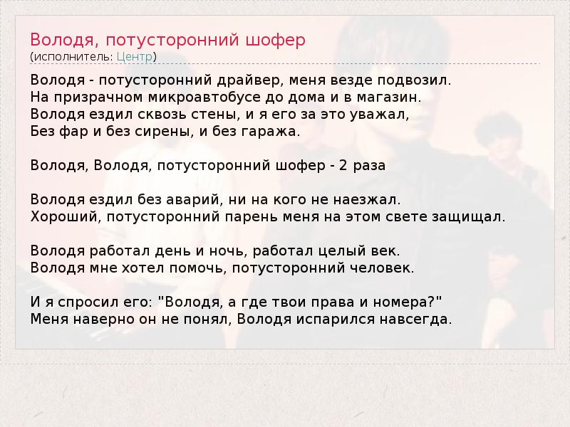 ГлавнаяИсполнителиЦентрВолодя, потусторонний шофер