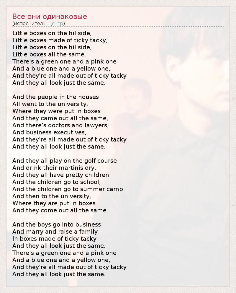 1 - кавер-версия песни, написанной Мальвиной Рейнольдс в 1962 году и исполненная Питом Сигером в 1963 году. Эта песня - политическая сатира развивающегося пригорода и конформистских взглядов среднего класса. Она о застройке однотипными домами - разноцветными "маленькими коробками" из дешевого, непрочного материала, которые выглядят одинаково.