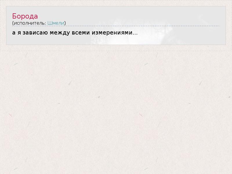 Это интересно:После различных проектов Шмеля и Лёса сама собой родилась группа Шмели (где-то в 1993 году). Сами Александр Шмелёв (Шмель) и Лёля Заседателева (Лёс) не выбирали себе этого названия, просто, несмотря на все предыдущие проекты, эту безумную парочку, независимо от собираемых ими составов и нововведений в своём, так называемом творчестве, все называли их одним словом "Шмели". Не смотря на... продолжение