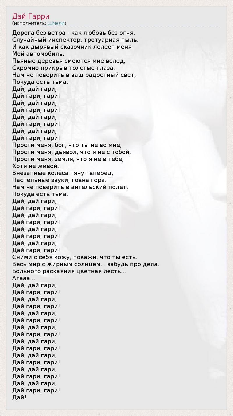 Дорога без ветра - как любовь без огня. Случайный инспектор, тротуарная пыль. И как дырявый сказочник лелеет меня Мой автомобиль. Пьяные деревья смеются мне вслед, Скромно прикрыв толстые глаза. Нам не поверить в ваш радостный свет, Покуда есть тьма. Дай, дай гари, Дай гари, гари! Дай, дай гари, Дай гари, гари! Дай, дай гари, Дай гари, гари! Дай, дай гари, Дай гари, гари! Прости меня, бог, что ты не во мне, Прости меня, дьявол, что я не с тобой, Прости меня, земля, что я не в тебе, Хотя не живой. Внезапные колёса тянут вперёд, Пастельные звуки, говна гора. Нам не поверить в ангельский полёт, Покуда есть тьма. Дай, дай гари, Дай гари, гари! Дай, дай гари, Дай гари, гари! Дай, дай гари, Дай гари, гари! Дай, дай гари, Дай гари, гари! Сними с себя кожу, покажи, что ты есть. Весь мир с жирным солнцем... забудь про дела. Больного раскаяния цветная лесть... Агааа... Дай, дай гари, Дай гари, гари! Дай, дай гари, Дай гари, гари! Дай, дай гари, Дай гари, гари! Дай, дай гари, Дай гари, гари! Дай, дай гари, Дай гари, гари! Дай, дай гари, Дай гари, гари! Дай, дай гари, Дай гари, гари! Дай, дай гари, Дай гари, гари! Дай!