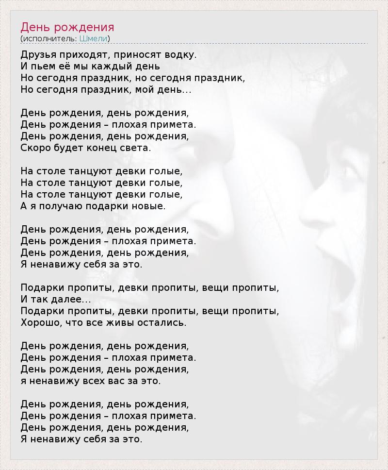 Друзья приходят, приносят водку. И пьем её мы каждый день Но сегодня праздник, но сегодня праздник, Но сегодня праздник, мой день… День рождения, день рождения, День рождения – плохая примета. День рождения, день рождения, Скоро будет конец света. На столе танцуют девки голые, На столе танцуют девки голые, На столе танцуют девки голые, А я получаю подарки новые. День рождения, день рождения, День рождения – плохая примета. День рождения, день рождения, Я ненавижу себя за это. Подарки пропиты, девки пропиты, вещи пропиты, И так далее… Подарки пропиты, девки пропиты, вещи пропиты, Хорошо, что все живы остались. День рождения, день рождения, День рождения – плохая примета. День рождения, день рождения, я ненавижу всех вас за это. День рождения, день рождения, День рождения – плохая примета. День рождения, день рождения, Я ненавижу себя за это.