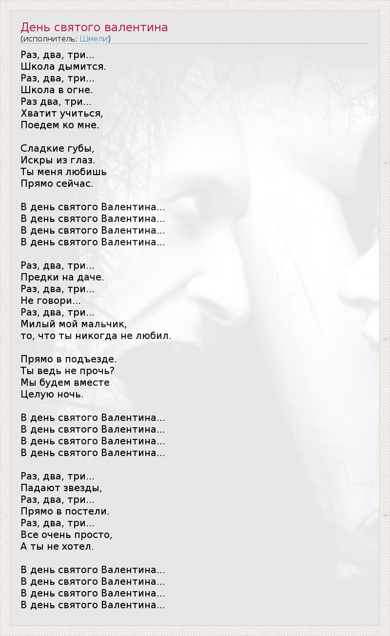 Раз, два, три... Школа дымится. Раз, два, три... Школа в огне. Раз два, три... Хватит учиться, Поедем ко мне. Сладкие губы, Искры из глаз. Ты меня любишь Прямо сейчас. В день святого Валентина... В день святого Валентина... В день святого Валентина... В день святого Валентина... Раз, два, три... Предки на даче. Раз, два, три... Не говори... Раз, два, три... Милый мой мальчик, то, что ты никогда не любил. Прямо в подъезде. Ты ведь не прочь? Мы будем вместе Целую ночь. В день святого Валентина... В день святого Валентина... В день святого Валентина... В день святого Валентина... Раз, два, три... Падают звезды, Раз, два, три... Прямо в постели. Раз, два, три... Все очень просто, А ты не хотел. В день святого Валентина... В день святого Валентина... В день святого Валентина... В день святого Валентина...