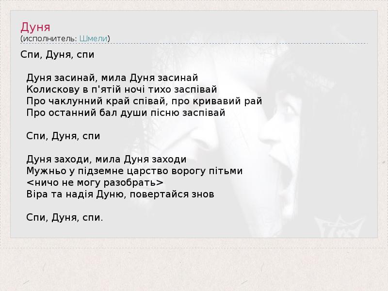 Спи, Дуня, спи Дуня засинай, мила Дуня засинай Колискову в п'ятій ночі тихо заспівай Про чаклунний край співай, про кривавий рай Про останний бал души пісню заспівай Спи, Дуня, спи Дуня заходи, мила Дуня заходи Мужньо у підземне царство ворогу пітьми <ничо не могу разобрать> Віра та надія Дуню, повертайся знов Спи, Дуня, спи.