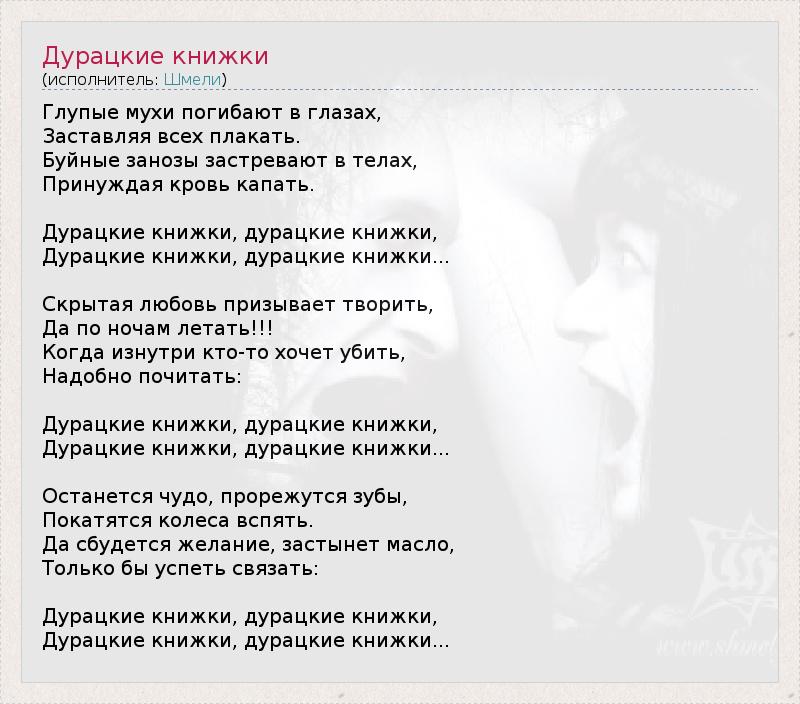 Глупые мухи погибают в глазах, Заставляя всех плакать. Буйные занозы застревают в телах, Принуждая кровь капать. Дурацкие книжки, дурацкие книжки, Дурацкие книжки, дурацкие книжки... Скрытая любовь призывает творить, Да по ночам летать!!! Когда изнутри кто-то хочет убить, Надобно почитать: Дурацкие книжки, дурацкие книжки, Дурацкие книжки, дурацкие книжки... Останется чудо, прорежутся зубы, Покатятся колеса вспять. Да сбудется желание, застынет масло, Только бы успеть связать: Дурацкие книжки, дурацкие книжки, Дурацкие книжки, дурацкие книжки...