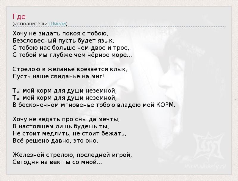 Хочу не видать покоя с тобою, Безсловесный пусть будет язык, С тобою нас больше чем двое и трое, С тобой мы глубже чем чёрное море… Стрелою в желанье врезается клык, Пусть наше свиданье на миг! Ты мой корм для души неземной, Ты мой корм для души неземной, В бесконечном мгновенье тобою владею мой КОРМ. Хочу не ведать про сны да мечты, В настоящем лишь будешь ты, Не стоит медлить, не стоит бежать, Всё решено давно, это оно, Железной стрелою, последней игрой, Сегодня на век ты со мной…