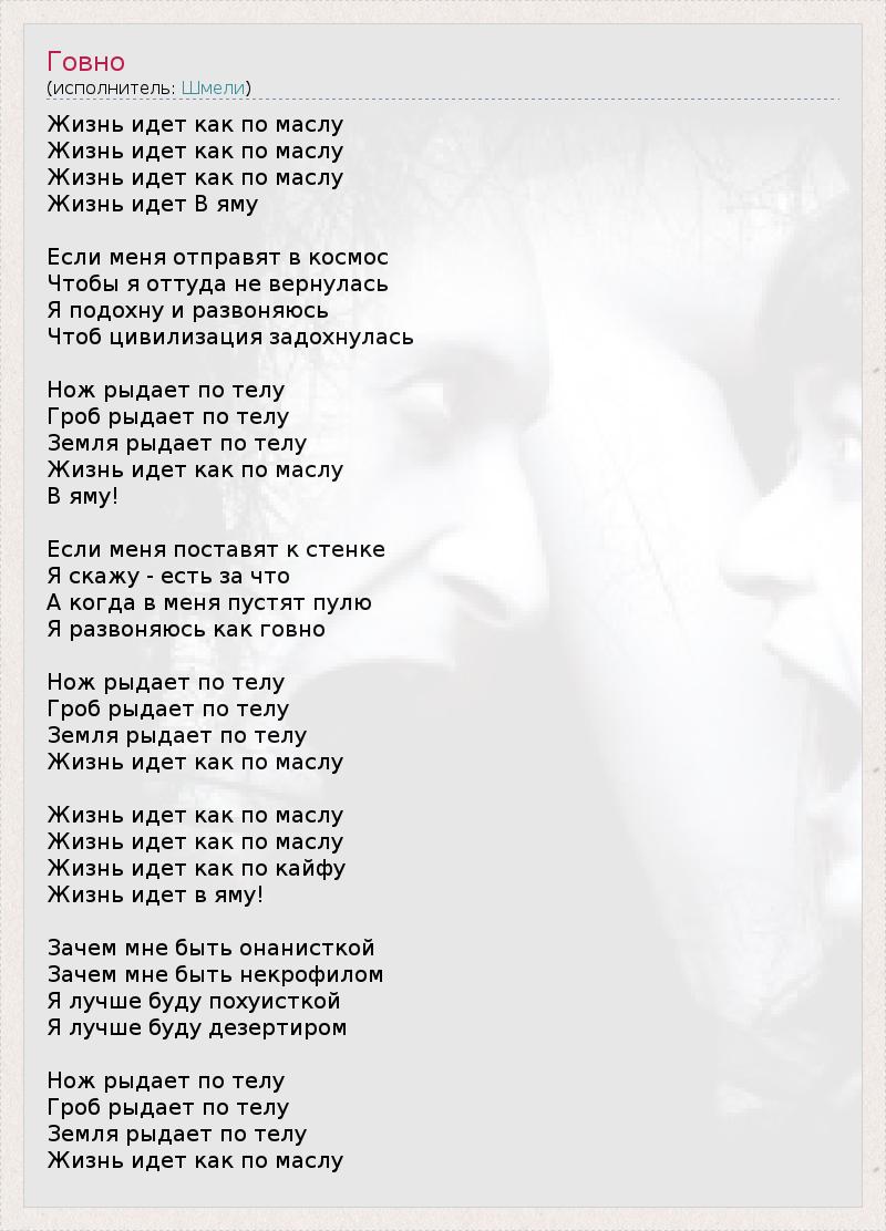 Жизнь идет как по маслу Жизнь идет как по маслу Жизнь идет как по маслу Жизнь идет В яму Если меня отправят в космос Чтобы я оттуда не вернулась Я подохну и развоняюсь Чтоб цивилизация задохнулась Нож рыдает по телу Гроб рыдает по телу Земля рыдает по телу Жизнь идет как по маслу В яму! Если меня поставят к стенке Я скажу - есть за что А когда в меня пустят пулю Я развоняюсь как говно Нож рыдает по телу Гроб рыдает по телу Земля рыдает по телу Жизнь идет как по маслу Жизнь идет как по маслу Жизнь идет как по маслу Жизнь идет как по кайфу Жизнь идет в яму! Зачем мне быть онанисткой Зачем мне быть некрофилом Я лучше буду похуисткой Я лучше буду дезертиром Нож рыдает по телу Гроб рыдает по телу Земля рыдает по телу Жизнь идет как по маслу