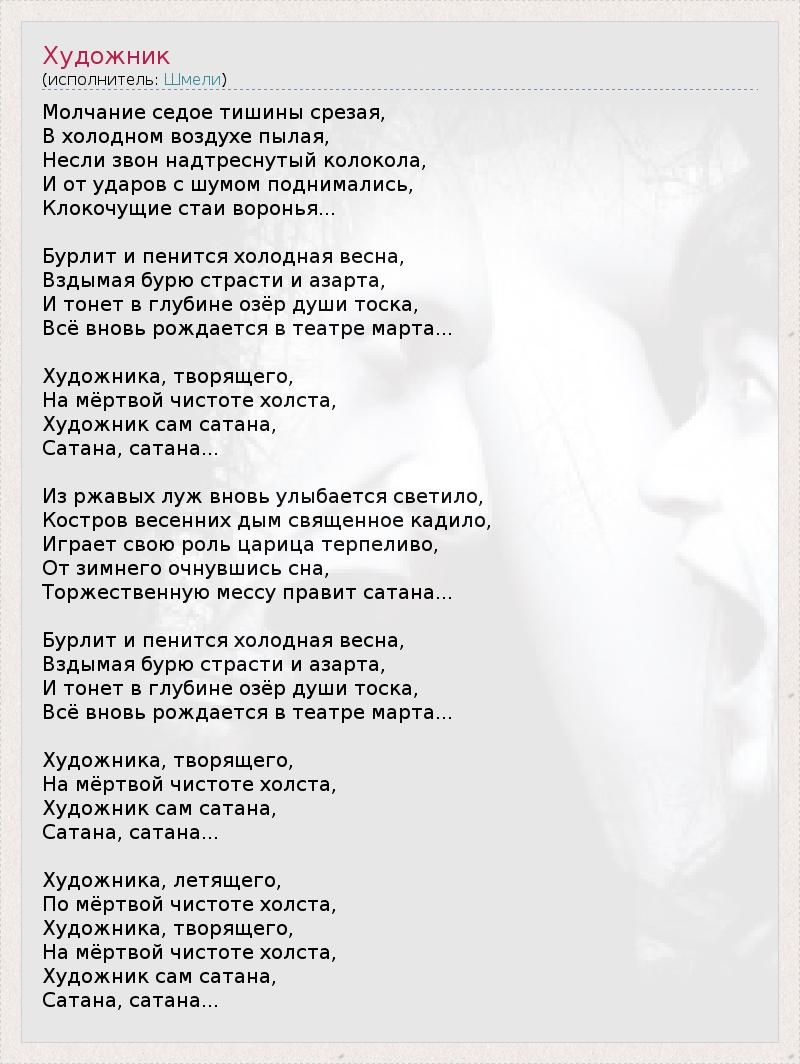 Молчание седое тишины срезая, В холодном воздухе пылая, Несли звон надтреснутый колокола, И от ударов с шумом поднимались, Клокочущие стаи воронья... Бурлит и пенится холодная весна, Вздымая бурю страсти и азарта, И тонет в глубине озёр души тоска, Всё вновь рождается в театре марта... Художника, творящего, На мёртвой чистоте холста, Художник сам сатана, Сатана, сатана... Из ржавых луж вновь улыбается светило, Костров весенних дым священное кадило, Играет свою роль царица терпеливо, От зимнего очнувшись сна, Торжественную мессу правит сатана... Бурлит и пенится холодная весна, Вздымая бурю страсти и азарта, И тонет в глубине озёр души тоска, Всё вновь рождается в театре марта... Художника, творящего, На мёртвой чистоте холста, Художник сам сатана, Сатана, сатана... Художника, летящего, По мёртвой чистоте холста, Художника, творящего, На мёртвой чистоте холста, Художник сам сатана, Сатана, сатана...
