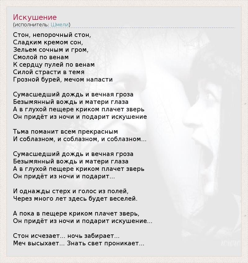 Стон, непорочный стон, Сладким кремом сон, Зельем сочным и гром, Смолой по венам К сердцу пулей по венам Силой страсти в темя Грозной бурей, мечом напасти Сумасшедший дождь и вечная гроза Безымянный вождь и матери глаза А в глухой пещере криком плачет зверь Он придёт из ночи и подарит искушение Тьма поманит всем прекрасным И соблазном, и соблазном, и соблазном... Сумасшедший дождь и вечная гроза Безымянный вождь и матери глаза А в глухой пещере криком плачет зверь Он придёт из ночи и подарит... И однажды стерх и голос из полей, Через много лет здесь будет веселей. А пока в пещере криком плачет зверь, Он придёт из ночи и подарит искушение... Стон исчезает... ночь забирает... Меч высыхает... Знать свет проникает...