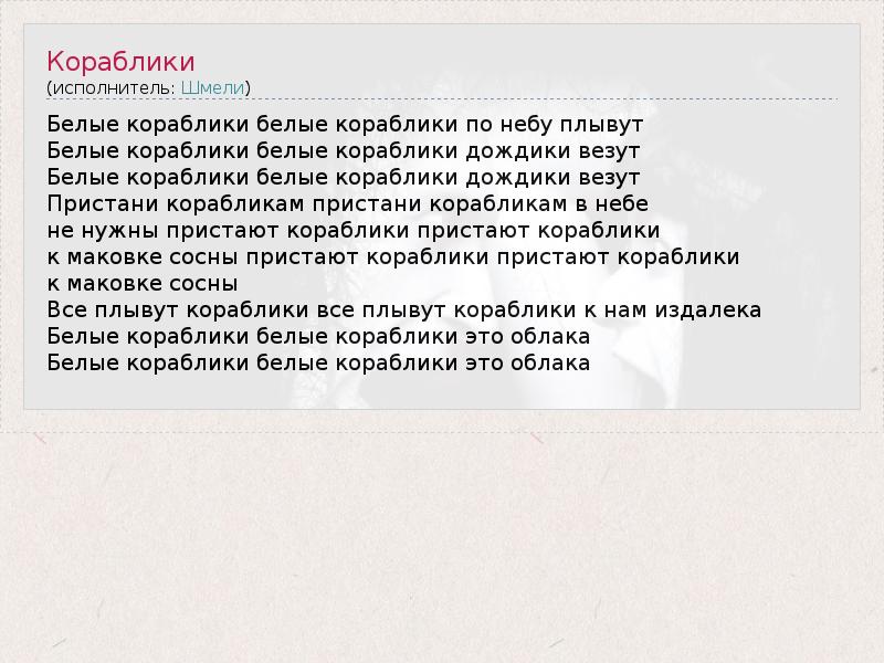 Белые кораблики белые кораблики по небу плывут Белые кораблики белые кораблики дождики везут Белые кораблики белые кораблики дождики везут Пристани корабликам пристани корабликам в небе не нужны пристают кораблики пристают кораблики к маковке сосны пристают кораблики пристают кораблики к маковке сосны Все плывут кораблики все плывут кораблики к нам издалека Белые кораблики белые кораблики это облака Белые кораблики белые кораблики это облака