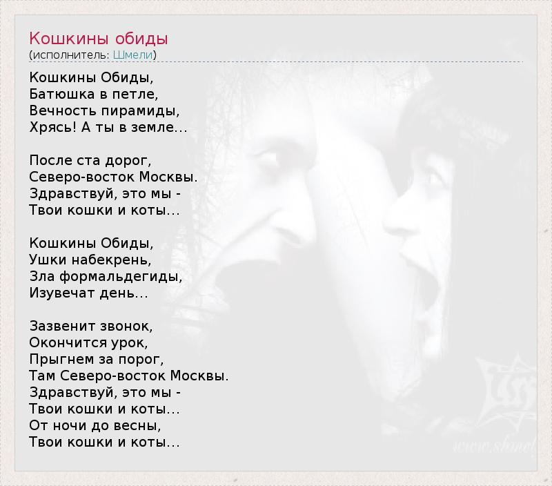 Кошкины Обиды, Батюшка в петле, Вечность пирамиды, Хрясь! А ты в земле… После ста дорог, Северо-восток Москвы. Здравствуй, это мы - Твои кошки и коты… Кошкины Обиды, Ушки набекрень, Зла формальдегиды, Изувечат день… Зазвенит звонок, Окончится урок, Прыгнем за порог, Там Северо-восток Москвы. Здравствуй, это мы - Твои кошки и коты… От ночи до весны, Твои кошки и коты…