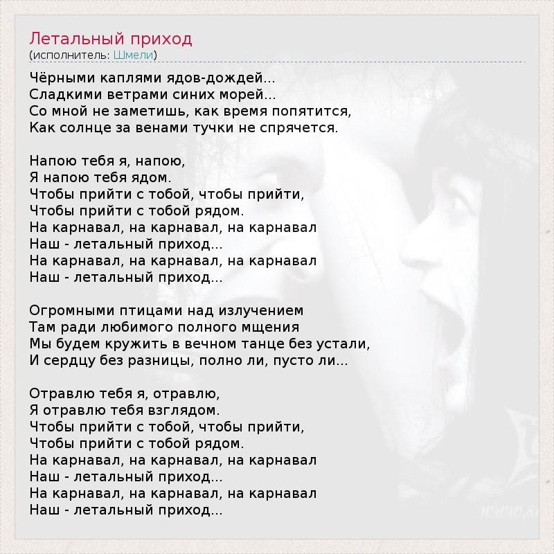 Чёрными каплями ядов-дождей... Сладкими ветрами синих морей... Со мной не заметишь, как время попятится, Как солнце за венами тучки не спрячется. Напою тебя я, напою, Я напою тебя ядом. Чтобы прийти с тобой, чтобы прийти, Чтобы прийти с тобой рядом. На карнавал, на карнавал, на карнавал Наш - летальный приход... На карнавал, на карнавал, на карнавал Наш - летальный приход... Огромными птицами над излучением Там ради любимого полного мщения Мы будем кружить в вечном танце без устали, И сердцу без разницы, полно ли, пусто ли... Отравлю тебя я, отравлю, Я отравлю тебя взглядом. Чтобы прийти с тобой, чтобы прийти, Чтобы прийти с тобой рядом. На карнавал, на карнавал, на карнавал Наш - летальный приход... На карнавал, на карнавал, на карнавал Наш - летальный приход...