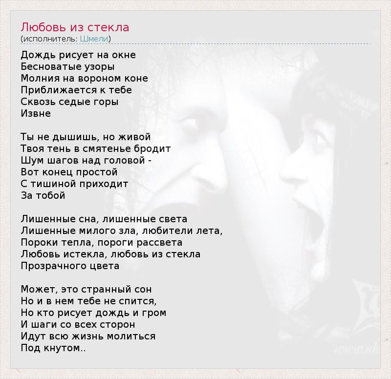 Дождь рисует на окне Бесноватые узоры Молния на вороном коне Приближается к тебе Сквозь седые горы Извне Ты не дышишь, но живой Твоя тень в смятенье бродит Шум шагов над головой - Вот конец простой С тишиной приходит За тобой Лишенные сна, лишенные света Лишенные милого зла, любители лета, Пороки тепла, пороги рассвета Любовь истекла, любовь из стекла Прозрачного цвета Может, это странный сон Но и в нем тебе не спится, Но кто рисует дождь и гром И шаги со всех сторон Идут всю жизнь молиться Под кнутом..