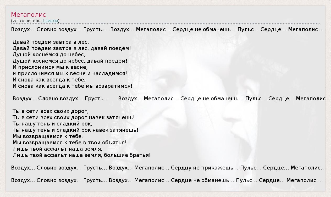 Воздух… Словно воздух… Грусть…  Воздух… Мегаполис… Сердце не обманешь… Пульс… Сердце… Мегаполис…