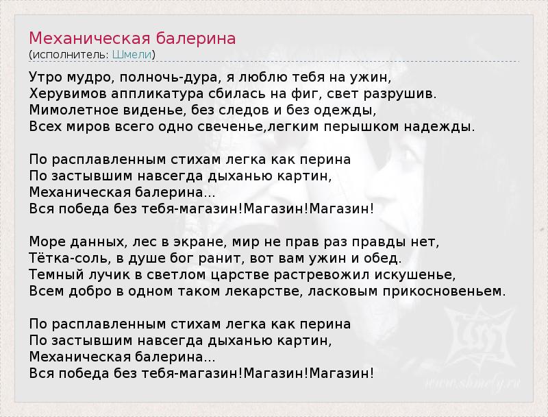 Утро мудро, полночь-дура, я люблю тебя на ужин, Херувимов аппликатура сбилась на фиг, свет разрушив. Мимолетное виденье, без следов и без одежды, Всех миров всего одно свеченье,легким перышком надежды. По расплавленным стихам легка как перина По застывшим навсегда дыханью картин, Механическая балерина... Вся победа без тебя-магазин!Магазин!Магазин! Море данных, лес в экране, мир не прав раз правды нет, Тётка-соль, в душе бог ранит, вот вам ужин и обед. Темный лучик в светлом царстве растревожил искушенье, Всем добро в одном таком лекарстве, ласковым прикосновеньем. По расплавленным стихам легка как перина По застывшим навсегда дыханью картин, Механическая балерина... Вся победа без тебя-магазин!Магазин!Магазин!