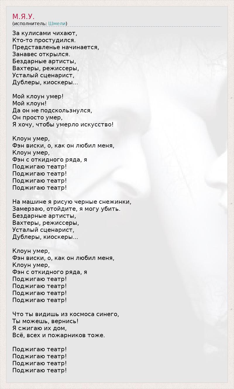 За кулисами чихают, Кто-то простудился. Представленье начинается, Занавес открылся. Бездарные артисты, Вахтеры, режиссеры, Усталый сценарист, Дублеры, киоскеры... Мой клоун умер! Мой клоун! Да он не подскользнулся, Он просто умер, Я хочу, чтобы умерло искусство! Клоун умер, Фэн виски, о, как он любил меня, Клоун умер, Фэн с откидного ряда, я Поджигаю театр! Поджигаю театр! Поджигаю театр! Поджигаю театр! На машине я рисую черные снежинки, Замерзаю, отойдите, я могу убить. Бездарные артисты, Вахтеры, режиссеры, Усталый сценарист, Дублеры, киоскеры... Клоун умер, Фэн виски, о, как он любил меня, Клоун умер, Фэн с откидного ряда, я Поджигаю театр! Поджигаю театр! Поджигаю театр! Поджигаю театр! Что ты видишь из космоса синего, Ты можешь, вернись! Я сжигаю их дом, Всё, всех и пожарников тоже. Поджигаю театр! Поджигаю театр! Поджигаю театр! Поджигаю театр!