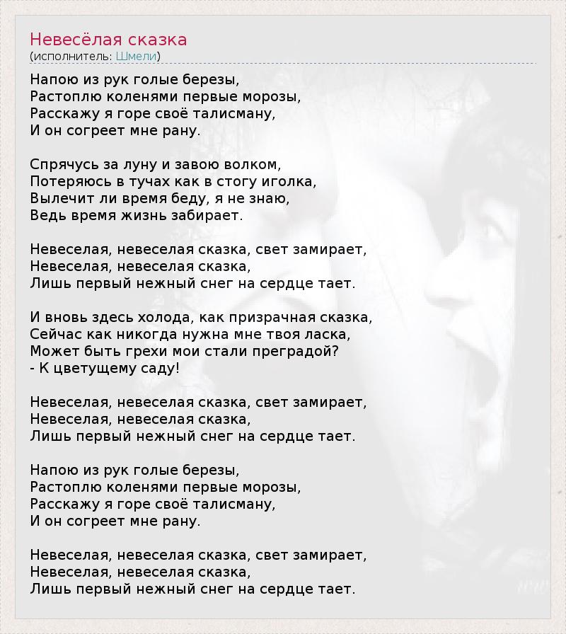 Напою из рук голые березы, Растоплю коленями первые морозы, Расскажу я горе своё талисману, И он согреет мне рану. Спрячусь за луну и завою волком, Потеряюсь в тучах как в стогу иголка, Вылечит ли время беду, я не знаю, Ведь время жизнь забирает. Невеселая, невеселая сказка, свет замирает, Невеселая, невеселая сказка, Лишь первый нежный снег на сердце тает. И вновь здесь холода, как призрачная сказка, Сейчас как никогда нужна мне твоя ласка, Может быть грехи мои стали преградой? - К цветущему саду! Невеселая, невеселая сказка, свет замирает, Невеселая, невеселая сказка, Лишь первый нежный снег на сердце тает. Напою из рук голые березы, Растоплю коленями первые морозы, Расскажу я горе своё талисману, И он согреет мне рану. Невеселая, невеселая сказка, свет замирает, Невеселая, невеселая сказка, Лишь первый нежный снег на сердце тает.