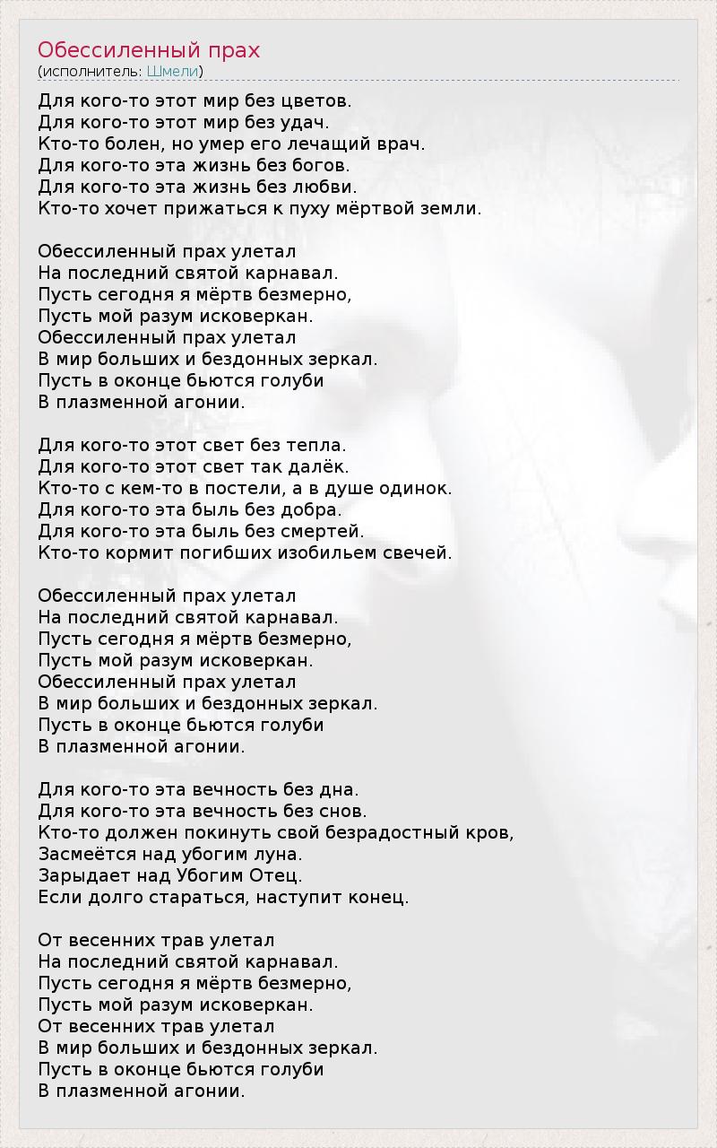 Для кого-то этот мир без цветов. Для кого-то этот мир без удач. Кто-то болен, но умер его лечащий врач. Для кого-то эта жизнь без богов. Для кого-то эта жизнь без любви. Кто-то хочет прижаться к пуху мёртвой земли. Обессиленный прах улетал На последний святой карнавал. Пусть сегодня я мёртв безмерно, Пусть мой разум исковеркан. Обессиленный прах улетал В мир больших и бездонных зеркал. Пусть в оконце бьются голуби В плазменной агонии. Для кого-то этот свет без тепла. Для кого-то этот свет так далёк. Кто-то с кем-то в постели, а в душе одинок. Для кого-то эта быль без добра. Для кого-то эта быль без смертей. Кто-то кормит погибших изобильем свечей. Обессиленный прах улетал На последний святой карнавал. Пусть сегодня я мёртв безмерно, Пусть мой разум исковеркан. Обессиленный прах улетал В мир больших и бездонных зеркал. Пусть в оконце бьются голуби В плазменной агонии. Для кого-то эта вечность без дна. Для кого-то эта вечность без снов. Кто-то должен покинуть свой безрадостный кров, Засмеётся над убогим луна. Зарыдает над Убогим Отец. Если долго стараться, наступит конец. От весенних трав улетал На последний святой карнавал. Пусть сегодня я мёртв безмерно, Пусть мой разум исковеркан. От весенних трав улетал В мир больших и бездонных зеркал. Пусть в оконце бьются голуби В плазменной агонии.