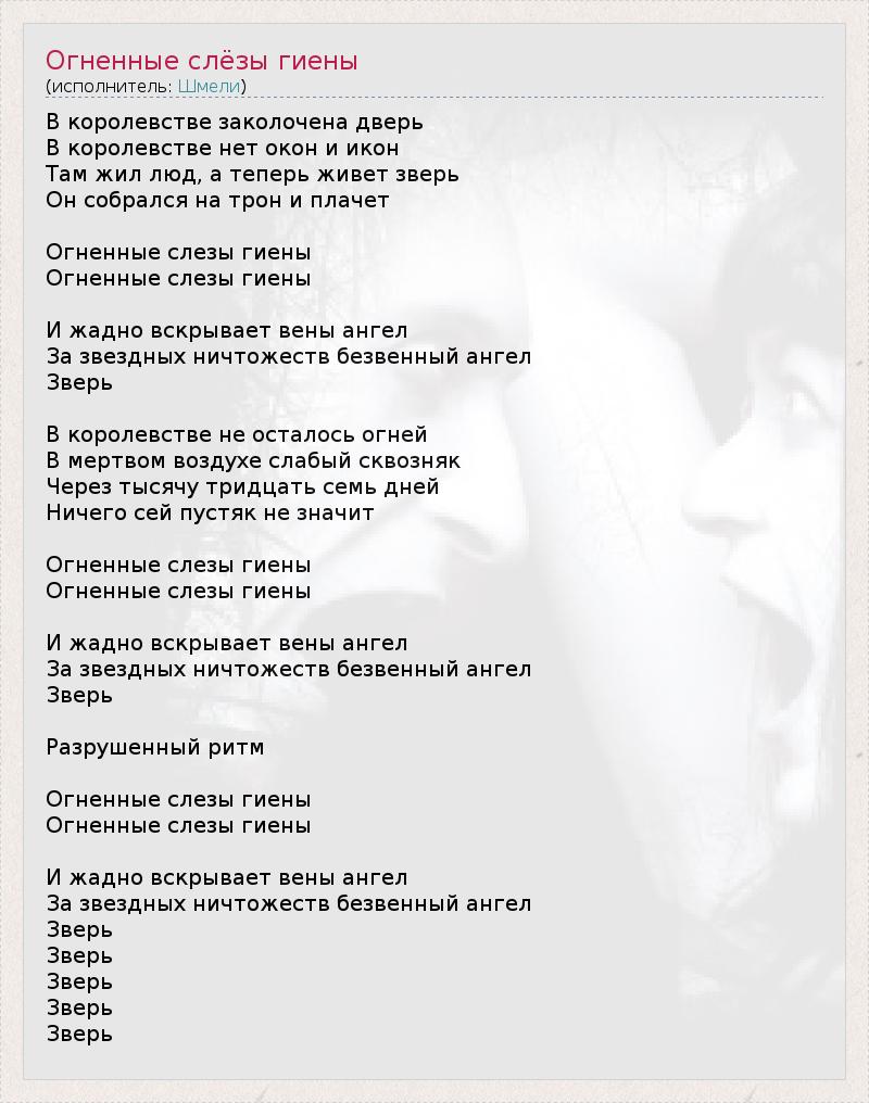 В королевстве заколочена дверь В королевстве нет окон и икон Там жил люд, а теперь живет зверь Он собрался на трон и плачет Огненные слезы гиены Огненные слезы гиены И жадно вскрывает вены ангел За звездных ничтожеств безвенный ангел Зверь В королевстве не осталось огней В мертвом воздухе слабый сквозняк Через тысячу тридцать семь дней Ничего сей пустяк не значит Огненные слезы гиены Огненные слезы гиены И жадно вскрывает вены ангел За звездных ничтожеств безвенный ангел Зверь Разрушенный ритм Огненные слезы гиены Огненные слезы гиены И жадно вскрывает вены ангел За звездных ничтожеств безвенный ангел Зверь Зверь Зверь Зверь Зверь