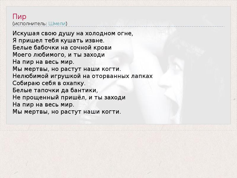 Искушая свою душу на холодном огне, Я пришел тебя кушать извне. Белые бабочки на сочной крови Моего любимого, и ты заходи На пир на весь мир. Мы мертвы, но растут наши когти. Нелюбимой игрушкой на оторванных лапках Собираю себя в охапку. Белые тапочки да бантики, Не прощенный пришёл, и ты заходи На пир на весь мир. Мы мертвы, но растут наши когти.