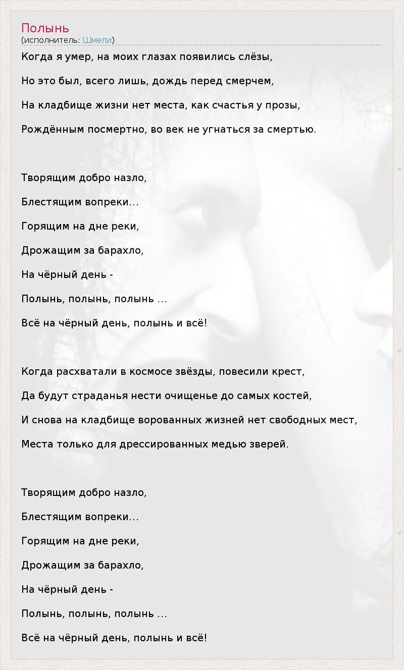 Когда я умер, на моих глазах появились слёзы, Но это был, всего лишь, дождь перед смерчем, На кладбище жизни нет места, как счастья у прозы, Рождённым посмертно, во век не угнаться за смертью. Творящим добро назло, Блестящим вопреки… Горящим на дне реки, Дрожащим за барахло, На чёрный день - Полынь, полынь, полынь … Всё на чёрный день, полынь и всё! Когда расхватали в космосе звёзды, повесили крест, Да будут страданья нести очищенье до самых костей, И снова на кладбище ворованных жизней нет свободных мест, Места только для дрессированных медью зверей. Творящим добро назло, Блестящим вопреки… Горящим на дне реки, Дрожащим за барахло, На чёрный день - Полынь, полынь, полынь … Всё на чёрный день, полынь и всё!