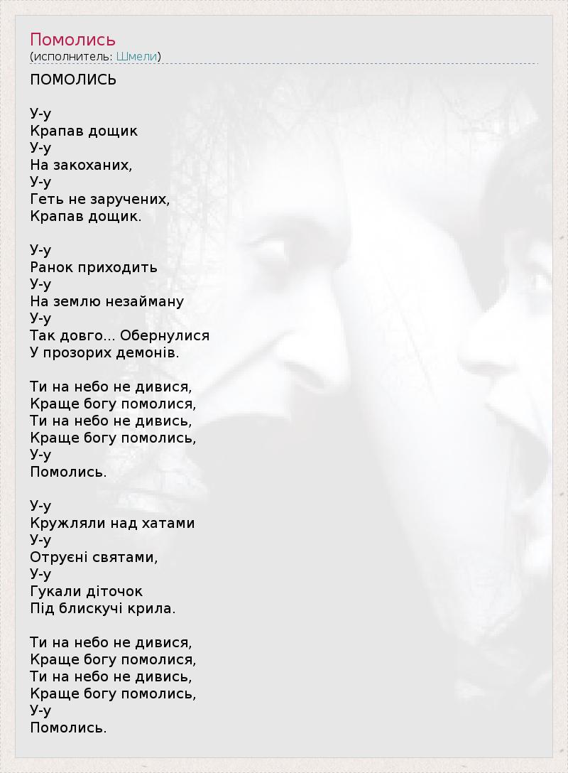 ПОМОЛИСЬ У-у Крапав дощик У-у На закоханих, У-у Геть не заручених, Крапав дощик. У-у Ранок приходить У-у На землю незайману У-у Так довго... Обернулися У прозорих демонів. Ти на небо не дивися, Краще богу помолися, Ти на небо не дивись, Краще богу помолись, У-у Помолись. У-у Кружляли над хатами У-у Отруєні святами, У-у Гукали діточок Під блискучі крила. Ти на небо не дивися, Краще богу помолися, Ти на небо не дивись, Краще богу помолись, У-у Помолись.