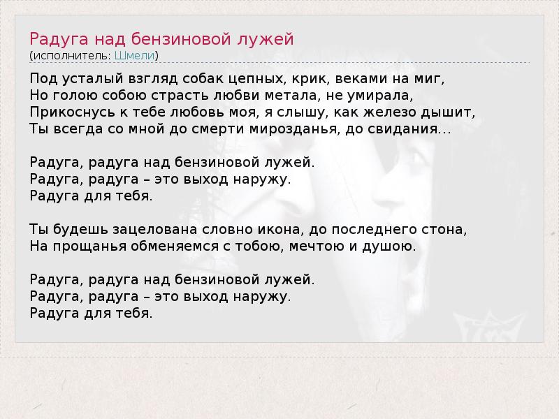 Под усталый взгляд собак цепных, крик, веками на миг, Но голою собою страсть любви метала, не умирала, Прикоснусь к тебе любовь моя, я слышу, как железо дышит, Ты всегда со мной до смерти мирозданья, до свидания… Радуга, радуга над бензиновой лужей. Радуга, радуга – это выход наружу. Радуга для тебя. Ты будешь зацелована словно икона, до последнего стона, На прощанья обменяемся с тобою, мечтою и душою. Радуга, радуга над бензиновой лужей. Радуга, радуга – это выход наружу. Радуга для тебя.