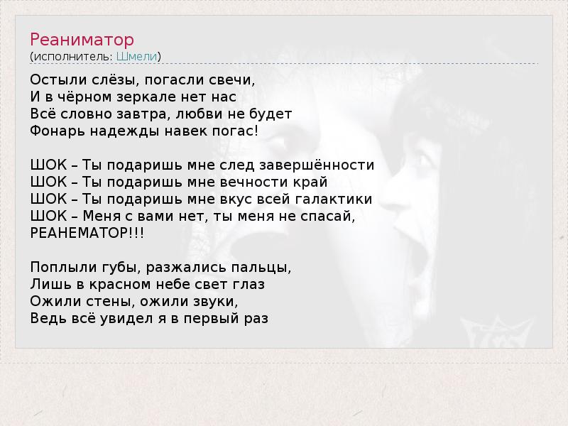 Остыли слёзы, погасли свечи, И в чёрном зеркале нет нас Всё словно завтра, любви не будет Фонарь надежды навек погас! ШОК – Ты подаришь мне след завершённости ШОК – Ты подаришь мне вечности край ШОК – Ты подаришь мне вкус всей галактики ШОК – Меня с вами нет, ты меня не спасай, РЕАНЕМАТОР!!! Поплыли губы, разжались пальцы, Лишь в красном небе свет глаз Ожили стены, ожили звуки, Ведь всё увидел я в первый раз