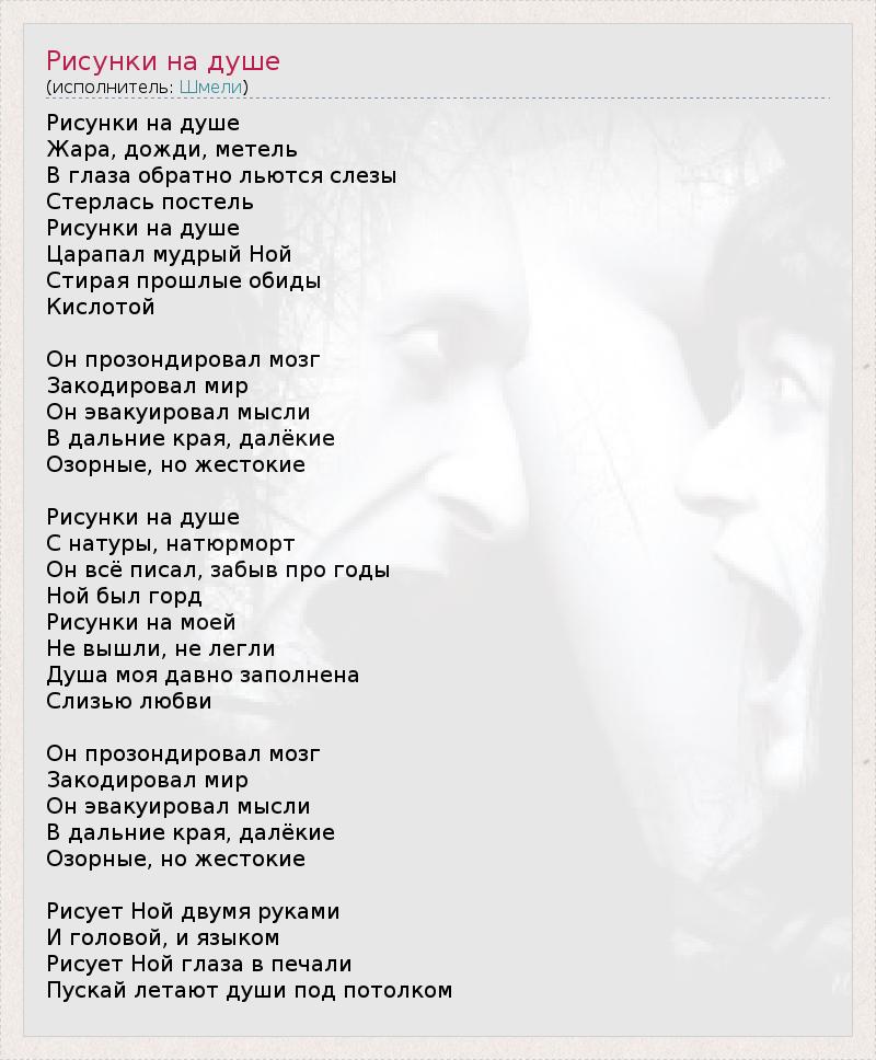 Рисунки на душе Жара, дожди, метель В глаза обратно льются слезы Стерлась постель Рисунки на душе Царапал мудрый Ной Стирая прошлые обиды Кислотой Он прозондировал мозг Закодировал мир Он эвакуировал мысли В дальние края, далёкие Озорные, но жестокие Рисунки на душе С натуры, натюрморт Он всё писал, забыв про годы Ной был горд Рисунки на моей Не вышли, не легли Душа моя давно заполнена Слизью любви Он прозондировал мозг Закодировал мир Он эвакуировал мысли В дальние края, далёкие Озорные, но жестокие Рисует Ной двумя руками И головой, и языком Рисует Ной глаза в печали Пускай летают души под потолком