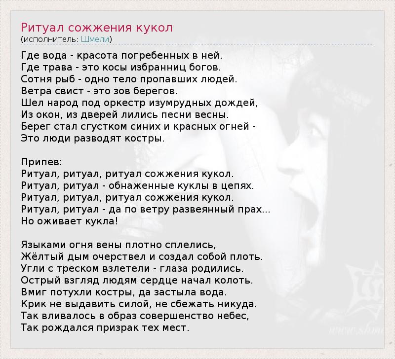 Где вода - красота погребенных в ней. Где трава - это косы избранниц богов. Сотня рыб - одно тело пропавших людей. Ветра свист - это зов берегов. Шел народ под оркестр изумрудных дождей, Из окон, из дверей лились песни весны. Берег стал сгустком синих и красных огней - Это люди разводят костры. Припев: Ритуал, ритуал, ритуал сожжения кукол. Ритуал, ритуал - обнаженные куклы в цепях. Ритуал, ритуал, ритуал сожжения кукол. Ритуал, ритуал - да по ветру развеянный прах... Но оживает кукла! Языками огня вены плотно сплелись, Жёлтый дым очерствел и создал собой плоть. Угли с треском взлетели - глаза родились. Острый взгляд людям сердце начал колоть. Вмиг потухли костры, да застыла вода. Крик не выдавить силой, не сбежать никуда. Так вливалось в образ совершенство небес, Так рождался призрак тех мест.