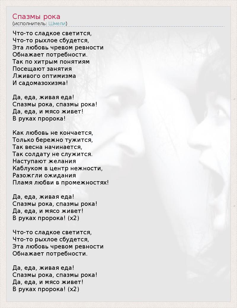 Что-то сладкое светится, Что-то рыхлое сбудется, Эта любовь чревом ревности Обнажает потребности. Так по хитрым понятиям Посещают занятия Лживого оптимизма И садомазохизма! Да, еда, живая еда! Спазмы рока, спазмы рока! Да, еда, и мясо живет! В руках пророка! Как любовь не кончается, Только бережно тужится, Так весна начинается, Так солдату не служится. Наступают желания Каблуком в центр нежности, Разожгли ожидания Пламя любви в промежностях! Да, еда, живая еда! Спазмы рока, спазмы рока! Да, еда, и мясо живет! В руках пророка! (х2) Что-то сладкое светится, Что-то рыхлое сбудется, Эта любовь чревом ревности Обнажает потребности. Да, еда, живая еда! Спазмы рока, спазмы рока! Да, еда, и мясо живет! В руках пророка! (х2)