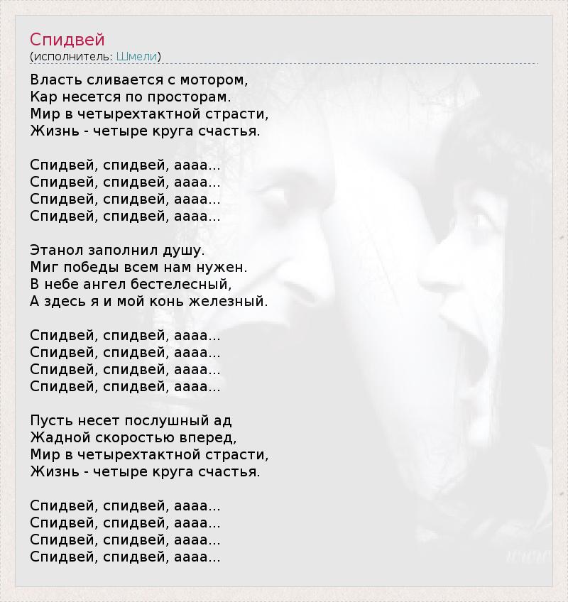 Власть сливается с мотором, Кар несется по просторам. Мир в четырехтактной страсти, Жизнь - четыре круга счастья. Спидвей, спидвей, аааа... Спидвей, спидвей, аааа... Спидвей, спидвей, аааа... Спидвей, спидвей, аааа... Этанол заполнил душу. Миг победы всем нам нужен. В небе ангел бестелесный, А здесь я и мой конь железный. Спидвей, спидвей, аааа... Спидвей, спидвей, аааа... Спидвей, спидвей, аааа... Спидвей, спидвей, аааа... Пусть несет послушный ад Жадной скоростью вперед, Мир в четырехтактной страсти, Жизнь - четыре круга счастья. Спидвей, спидвей, аааа... Спидвей, спидвей, аааа... Спидвей, спидвей, аааа... Спидвей, спидвей, аааа...