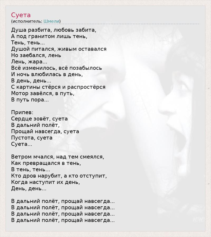 Душа разбита, любовь забита, А под гранитом лишь тень, Тень, тень... Душой питался, живым оставался Но заебался, лень Лень, жара... Всё изменилось, всё позабылось И ночь влюбилась в день, В день, день... С картины стёрся и распростёрся Мотор завёлся, в путь, В путь пора... Припев: Сердце зовёт, суета В дальний полёт, Прощай навсегда, суета Пустота, суета Суета... Ветром мчался, над тем смеялся, Как превращался в тень, В тень, тень... Кто дров нарубит, а кто отступит, Когда наступит их день, День, день... В дальний полёт, прощай навсегда... В дальний полёт, прощай навсегда... В дальний полёт, прощай навсегда... В дальний полёт, прощай навсегда...