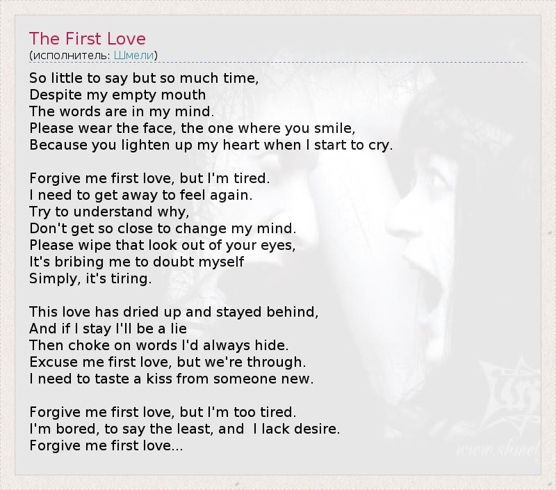 Почти нечего сказать, но столько времени, Несмотря на то, что я не могу вымолвить и слова, В голове столько всего, что я хочу сказать. Пожалуйста, улыбнись, Потому что ты успокаиваешь мое сердце, когда я начинаю плакать. Прости меня, первая любовь, но я устала. Мне нужно уйти, чтоб вновь я могла испытывать чувства, Попытаться понять, почему же не получается, Не подходи близко, чтобы изменить мое решение, Пожалуйста, не смотри на меня так, Этот взгляд заставляет сомневаться меня, Просто, это очень утомительно Эта любовь иссякла и осталась позади, И если я останусь, я солгу, Мне придется задумываться, прежде чем что-то сказать, Прости меня, первая любовь, между нами все кончено, Мне нужно отведать поцелуй еще кого-нибудь Прости меня, первая любовь, но я слишком устала, По меньшей мере, мне надоело, да и нет желания, Прости меня, первая любовь...