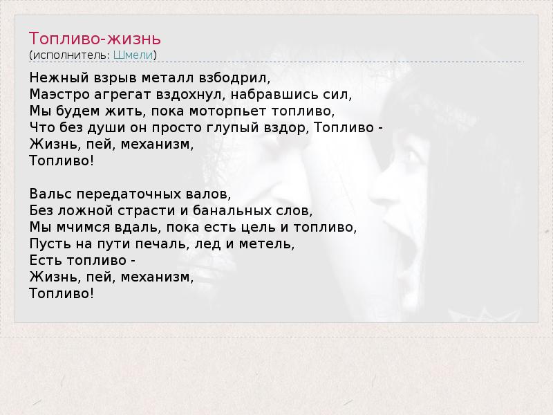 Нежный взрыв металл взбодрил, Маэстро агрегат вздохнул, набравшись сил, Мы будем жить, пока моторпьет топливо, Что без души он просто глупый вздор, Топливо - Жизнь, пей, механизм, Топливо! Вальс передаточных валов, Без ложной страсти и банальных слов, Мы мчимся вдаль, пока есть цель и топливо, Пусть на пути печаль, лед и метель, Есть топливо - Жизнь, пей, механизм, Топливо!