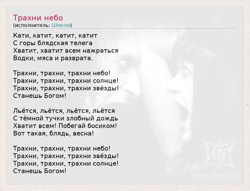 Кати, катит, катит, катит С горы блядская телега Хватит, хватит всем нажраться Водки, мяса и разврата. Трахни, трахни, трахни небо! Трахни, трахни, трахни солнце! Трахни, трахни, трахни звёзды! Станешь Богом! Льётся, льётся, льётся, льётся С тёмной тучки злобный дождь Хватит всем! Побегай босиком! Вот такая, блядь, весна! Трахни, трахни, трахни небо! Трахни, трахни, трахни звёзды! Трахни, трахни, трахни солнце! Станешь Богом!