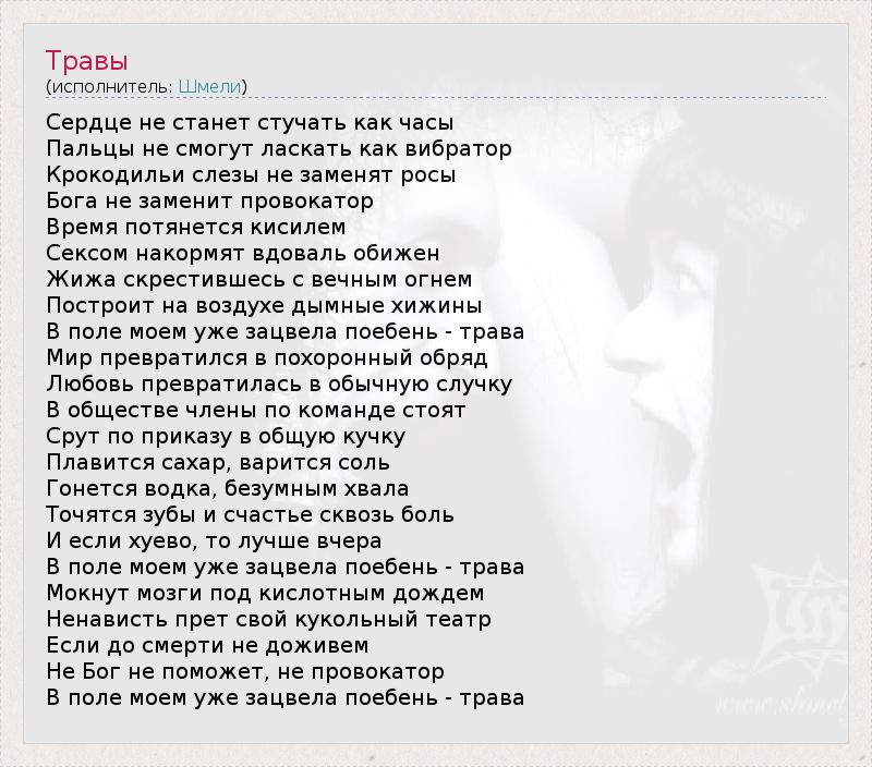 Сердце не станет стучать как часы Пальцы не смогут ласкать как вибратор Крокодильи слезы не заменят росы Бога не заменит провокатор Время потянется кисилем Сексом накормят вдоваль обижен Жижа скрестившесь с вечным огнем Построит на воздухе дымные хижины В поле моем уже зацвела поебень - трава Мир превратился в похоронный обряд Любовь превратилась в обычную случку В обществе члены по команде стоят Срут по приказу в общую кучку Плавится сахар, варится соль Гонется водка, безумным хвала Точятся зубы и счастье сквозь боль И если хуево, то лучше вчера В поле моем уже зацвела поебень - трава Мокнут мозги под кислотным дождем Ненависть прет свой кукольный театр Если до смерти не доживем Не Бог не поможет, не провокатор В поле моем уже зацвела поебень - трава